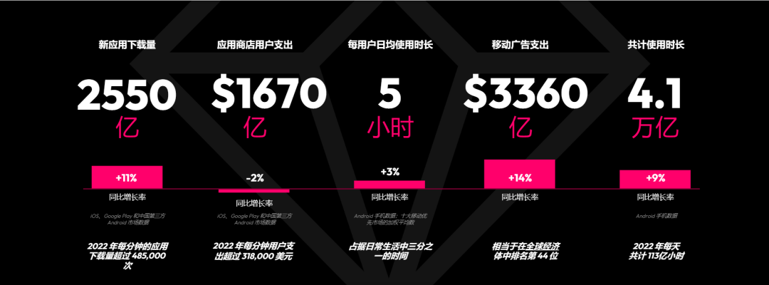 全球领先移动数据分析公司data.ai(原App Annie)于近日发布了《2023年移动市场报告》。报告总结了2022年全球移动应用市场的整体表现与发展新趋势,data.ai表示,尽管2022年全球应用商店支出有所收缩,但移动应用需求稳步提升,全球应用下载量、全球移动广告支出、全球用户使用时长均呈现增长态势。其中,在经济逆风的情况下,2022年,全球移动广告支出达3360亿美元,同比增长14%。