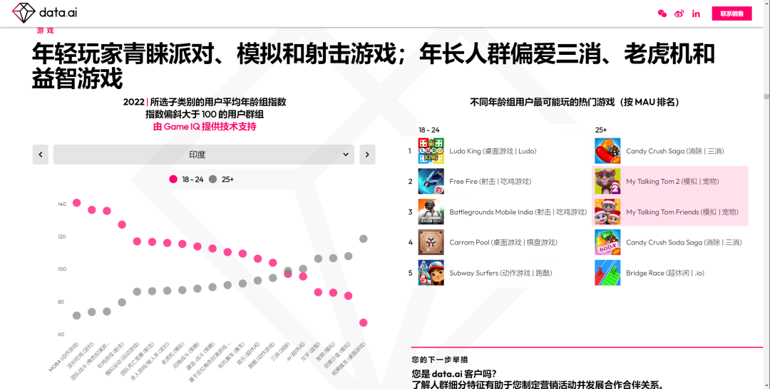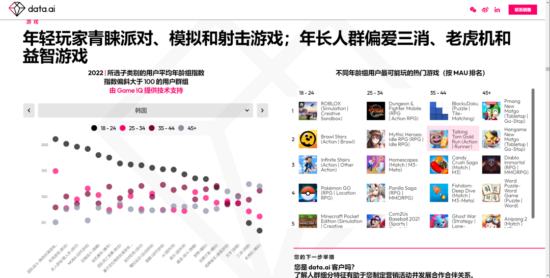 值得关注的是,本次报告首次揭示了全球不同年龄段玩家在移动游戏上的不同喜好。根据data.ai的MAU数据统计,公司旗下《汤姆猫跑酷》《我的安吉拉2》《我的汤姆猫2》《汤姆猫总动员》等数款产品分别占据韩国、巴西、印度、印尼等多个市场的年轻人MAU前五榜单。其中,公司跑酷精品《汤姆猫跑酷》在韩国市场收获了35-44岁用户群体的喜爱,位居该年龄段玩家MAU产品榜TOP2。而除了经典优势产品的稳定人气外,公司近年来打造的创意新作《汤姆猫总动员》《我的安吉拉2》在印度、印尼等互联网新兴市场也成为“25+”年轻玩家心头好,稳居当地月活榜单前三。